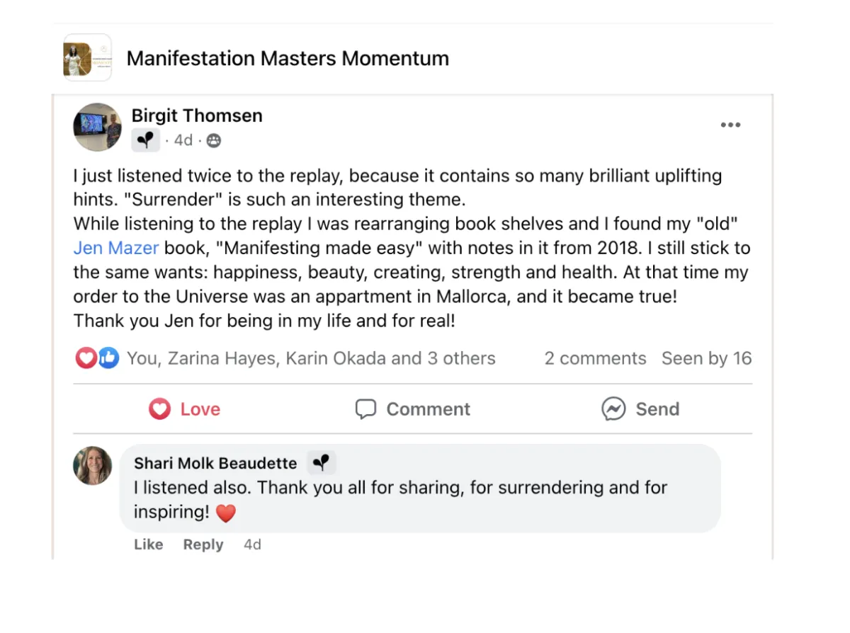 Each time Jen runs this program, a new Facebook group is formed for intimate connection. That way everyone is going through the program at the same time, and a safe community is there to support you. When you finally have your tribe of people reflecting your dream back to you, it will manifest much faster!