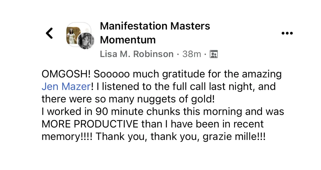 "My manifesting has shot way up from Manifestation Masters and our coaching call that we had at the conclusion of the program.